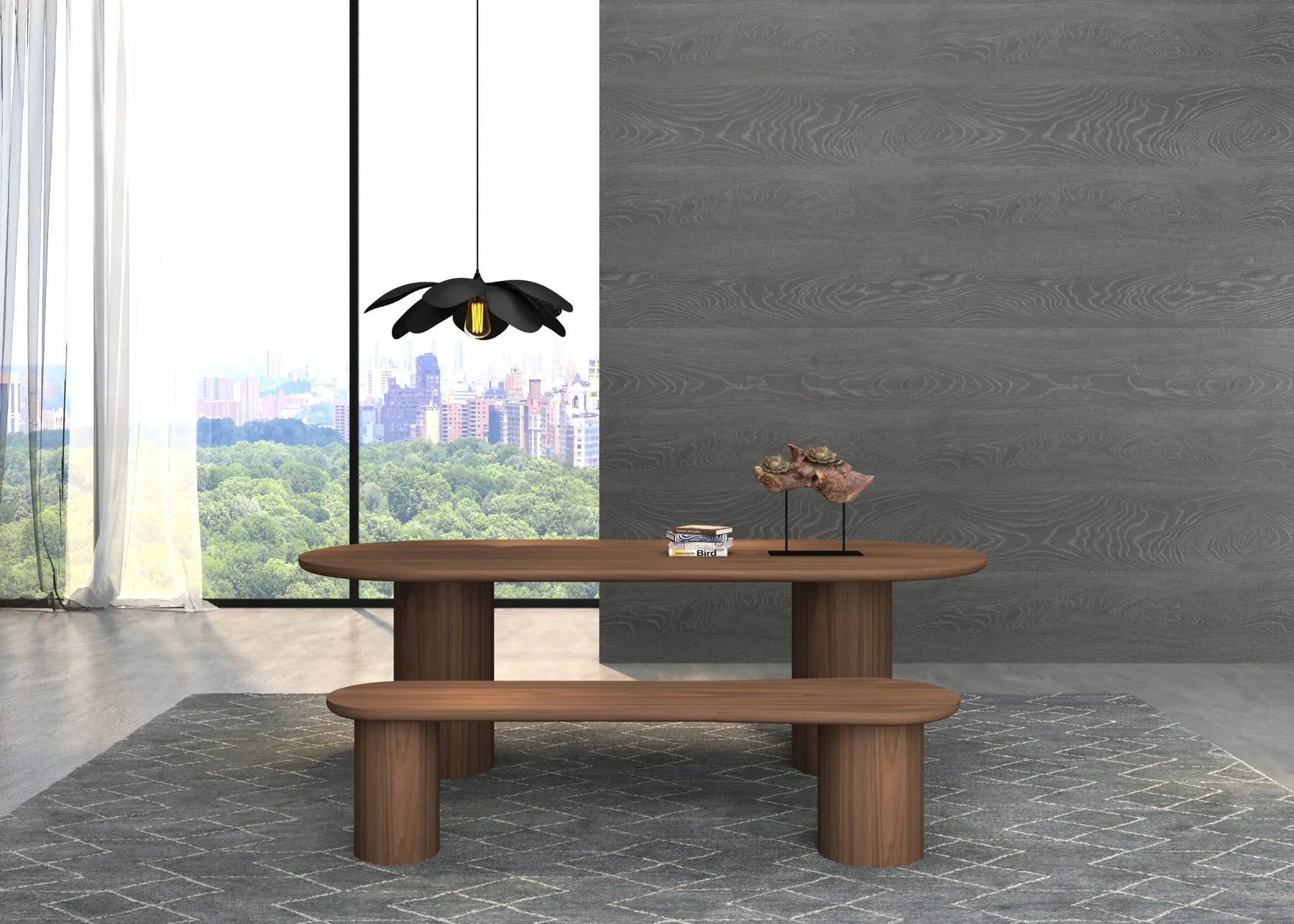 Z blatem o grubości 4 cm z forniru orzechowego i dwoma solidnymi, okrągłymi nogami, stół Bjorn oferuje stabilną i trwałą podstawę – zaprojektowaną na lata użytkowania. Robusta konstrukcja gwarantuje, że ten stół przetrwa pokolenia.